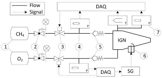 - Jiaq, Z.; Qing-Lian, L.; Chi-bing, S. Ignition characteristics and combustion performances of a LO2/GCH4 small thrust rocket engine. J. Cent. South Univ. 2018, 25, 646–652. [Google Scholar] [CrossRef]