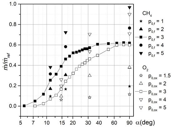 Relative mass flow rate as a function of the valves opening angle and line total pressure .