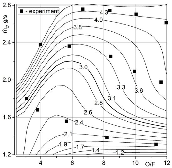 There were 14 experimental points in the O/F ratio and mass-flow-rate domain used to draw the contours of Figure 5.