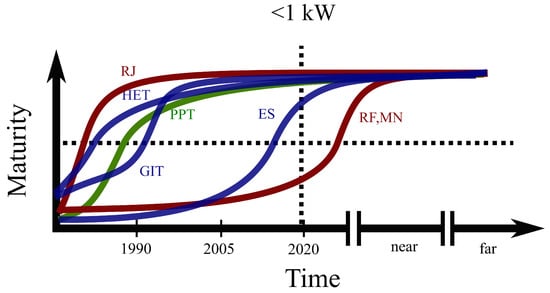 - Lev, D.; Myers, R.M.; Lemmer, K.M.; Kolbeck, J.; Koizumi, H.; Polzin, K. The technological and commercial expansion of electric propulsion. Acta Astronaut. 2019, 159, 213–227. [Google Scholar] [CrossRef]