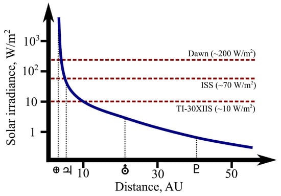 - Stella, P.M.; DiStefano, S.; Rayman, M.D.; Ulloa-Severino, A. Early mission power assessment of the Dawn solar array. In Proceedings of the 2009 34th IEEE Photovoltaic Specialists Conference (PVSC), Philadelphia, PA, USA, 7–12 June 2009; pp. 001617–001621. [Google Scholar]