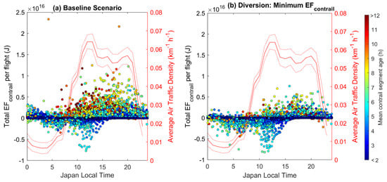 The EFcontrail for each flight vs. the time of day when these flights occur from one run of Monte Carlo simulation, where (a) is the baseline scenario; and (b) is the strategy with flight trajectories changed to achieve a minimum EFcontrail. All contrail-forming flights in the CARATS Open Data are included, and the mean contrail segment age is shown by the symbol colour. The red lines refer to the right-axis, showing the air traffic density > 20,000 feet (mean ± 1.96σ) vs. the time of the day.