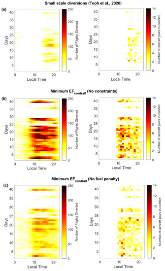 For these three diversion strategies, Table 2 provides a summary of the total number of flights diverted and the number of incidences where flights experience a LOS, while Figure 3 shows the hourly variation of these quantities for the 42 days of air traffic data available. There is a day-to-day variation in the number of flights diverted that depends on ambient meteorological conditions [28], and ATM conflicts generally occur between 09:00 and 23:00 local time (Figure 3). Although the total number of flights diverted in the minimum EFcontrail strategy (with no constraints) is approximately 10 times higher than the small-scale diversion strategy (22,696 vs. 2196 flights), there is a lower proportion of flights in conflict relative to the total number of flights diverted (9.06% vs. 13.8%). This is because the small-scale diversion strategy primarily diverts flights between 15:00 and 22:00 local time (Figure 3a, left), when ATD is high (as shown in Figure 2) and when ATM conflicts occur more frequently (Figure 3a, right). Conversely, the minimum EFcontrail strategy (with no constraints) also diverts flights before 09:00 local time (Figure 3b, left), when ATD is low (Figure 2) so that these diversions introduce few ATM conflicts (Figure 3b, right). The number of ATM impacts in the third strategy (minimum EFcontrail with fuel penalty constraints) lies in between those of the small-scale diversion strategy and the unconstrained minimum EFcontrail strategy (Table 2 and Figure 3c).