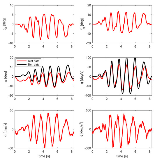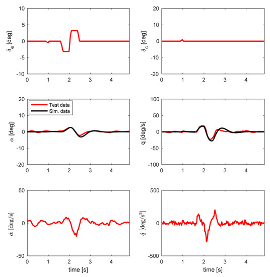 Validation data from earlier flight tests. Test data are shown in red, while simulated model data are shown in black for the states angle-of-attack and pitch rate.