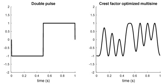 A double pulse (DP) input (left) and a crest factor optimized multisine (MS) input (right).