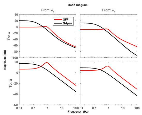 Note that the frequency span of 1–10 Hz was chosen to excite the short period flight-mechanical model for the GFF subscale demonstrator. This is higher than the 0.1–2 Hz typically used for full-sized aircraft as in [14]. It is a well known fact that small-scale aircraft have this short period characteristic. This phenomenon can be seen in the Bode plot of Figure 8, where the model of a full-scale Saab JAS 39 Gripen used in [13] is compared to the subscale GFF model from (17).