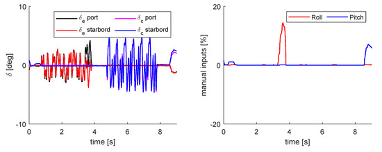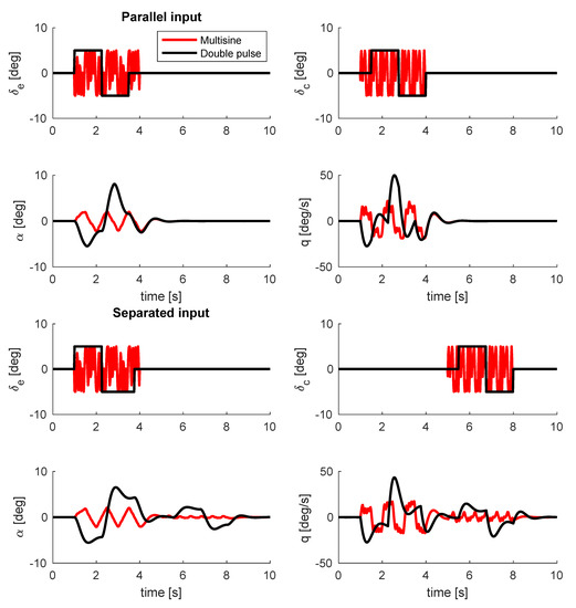 Two types of signals were evaluated (see Figure 6). The first one is a double pulse, commonly used for estimating aerodynamic derivatives from flight test data. The second one is a multisine signal: