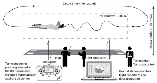The flight test campaign was carried out at a closed airfield located inside the controlled airspace of a nearby airport. Hence, all operations were carried out within VLOS and in contact with the corresponding air traffic control service. This type of operation severely constrains the available flight area, as shown in Figure 2; however, its main advantage is that it does not require a segregated airspace, a large infrastructure or a large team. Figure 12 describes the test procedure including the three main roles: one test conductor, responsible for controlling the test execution; one pilot, flying the aircraft from the ground control; and one test monitor, evaluating the test results between the flights and supervising the safety area. Test cards were used to predefine the manoeuvres to be performed in each flight. The corresponding commands and excitation signals were pre-programmed in advance and automatically executed from the radio-control transmitter by means of a novel flight test software program developed at Linköping University and described in [9]. This program augments the pilot control without requiring a closed-loop flight control system on-board. On the field, the easy adjustment and reconfiguration of the test sequences between flights also contributed to the agility and efficiency of this campaign.