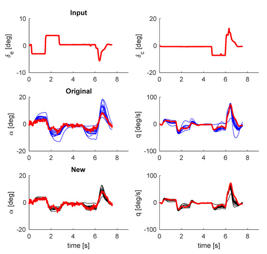Validation simulations with flight test data in red. Upper: input, middle: output original method and bottom: output new method.
