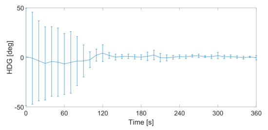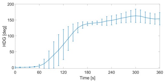 As shown in Figure 4, a similar period of 6 minutes is used to analyze the landing performance. The end of this segment corresponds to the parking brake set. HDG equal to 0 in Figure 4, corresponds with the Runway heading 355 of Runway 18/36 of Milano Linate airport. It is possible to see that the deviation from the runway direction is above 50 for the first 100 s. Deviation from runway mid-axis depends on the route that the pilots perform to align with the path. Indeed, the position of aircraft at the beginning of the segment depends on the different position reached per pilot during cruising flight in accordance with the instructions of the instructor. From 120 s on, the standard deviation decreases and becomes negligible during the last 100 s, since the pilots are well aligned with the descent path.