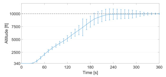 Figure 5 shows the altitude profile during the TO phase. The mission calls for an altitude of 10,000 ft and all pilots reach it after about 240 s from the initial maneuvers. The altitude in Figure 5 and Figure 6 starts from 340 ft that is the elevation of Milano Linate airport runway 36.