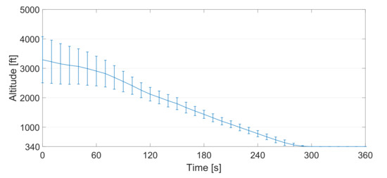 The time interval of 360 s is sufficient to analyze the range within which all the pilots reaches 10,000 ft, as required by the mission. The deviation gradually changes in the interval between 150 and 240 s because the pilots climb with different rates, not respecting the rate of climb imposed by the task. Concerning the LA phase, the same considerations made for the heading variation, shown in Figure 4, can be made here. As requested by the instructor in the pre-briefing session, the landing maneuver had to be performed according to the JEPPESEN 21-1 passing through DIXER. The reference altitude for the final approach was 3000 ft. The high deviation values shown in Figure 6 for the first 50 s are related to the way in which the pilots had performed the approach phase to the airport, starting from the previously performed task.