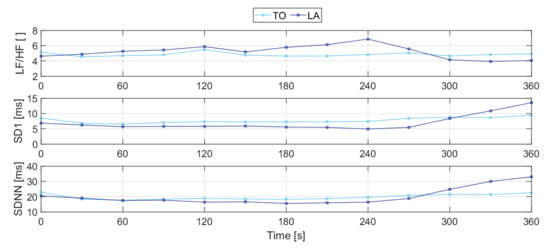 On the other hand, with reference to the LA segment, it is possible to observe that the results show a first peak of LF/HF at 120 s, representative of an increase of the mental workload or stress. The trend of LF/HF anticipates the minimum of SDNN which occurs at about 180 s and that represents a high workload as well. Conversely, SD1 slightly decreases in the interval 0–60 s and then it remains almost contants untill 270 s, suggesting just an initial small increase of workload level. Moreover, the LF/HF ratio reaches its maximum value at 240 s, and then it reduces, indicating that the proximity with ground causes an increase in pilots’ mental stress level. From this point on, the levels of LF/HF decreases while the SD1 and SDNN increase indicating a reduction of the workload or stress level. This may be due to the fact that both the maneuver and mission are almost completed and the pilot begins to relax.