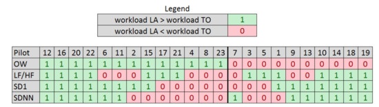 Figure 12 shows the boolean relations between the estimation of workload level for LA and TO segments for each pilot and for both subjective and objective measurements based on the hypothesis that the workload for the LA segment is greater than the workload for the TO segment. If the assumption is verified then the cell that relates the measure index with the pilot index is filled in green and the boolean relation equals 1. Conversely, the cell is colored in red and the relation equals 0. This simple representation allows concluding that about the of the pilot population perceive the LA segment as more demanding in terms of overall workload with respect to the TO phase, as shown by result corresponding to the subjective NASA-TLX overall workload OW assessment. However, observing Figure 12 it can be noted that the objective indexes are often in disagreement with the subjective ones. The better agreement between the NASA-TLX OW measure and objective indexes is obtained for the with a percentage agreement of . More in detail, from Figure 12, it appears that: pilots 12, 16, 20 and 22 are the only ones with a full correspondence between the overall workload evaluated by NASA-TLX and what emerges from the analysis of the HRV indexes; pilots 4, 8 and 23 show a perception of subjective overall workload for landing segment greater than the take-off one, namely OW LA > OW TO, but the HRV indexes show an opposite trend; vice versa, the OW LA is lower than OW TO (values of zero for the OW) for pilots 10, 14, 18 and 19 but the HRV indexes show discordant result. In all other cases, at least one index is in disagreement with the hypothesis.
