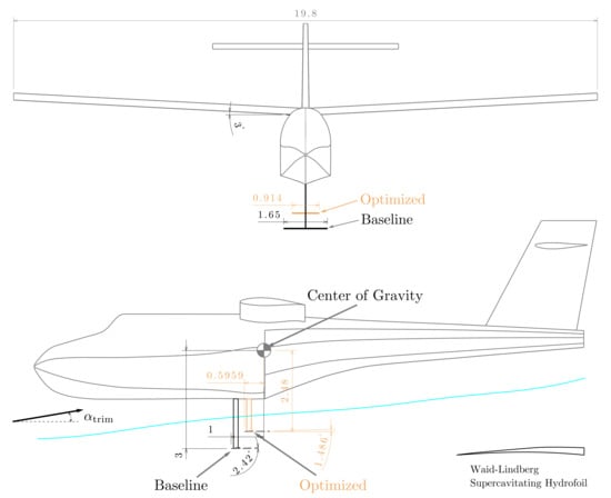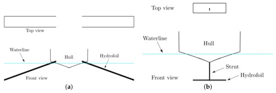 There are many possible hydrofoil configurations for amphibious aircraft including, but not limited to, surface-piercing hydrofoils, foldable-protruding hydrofoils, and strut-based hydrofoils [3,24]. As the name suggests, a surface-piercing hydrofoil has a hydrofoil protruding directly from the hull of the aircraft that pierces the water surface, such as the ones in LISA Akoya. When such a hydrofoil is foldable, it is considered as a foldable-protruding hydrofoil. The last category refers to a hydrofoil with a strut-based structure extending from the body of the aircraft. The surface-piercing and strut-based hydrofoil configurations are depicted in Figure 1. For the water-takeoff consideration in our design and analysis discussion, the hydrofoils are assumed to be fully deployed. The major dimensional constraints that will be discussed are relevant to this state, as well.