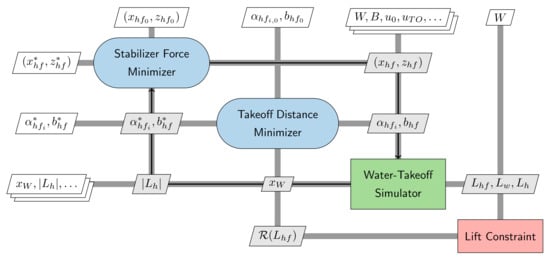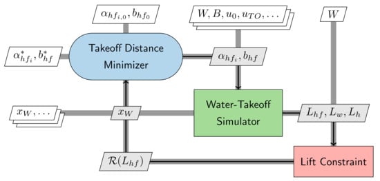 In this work, the hydrofoil’s span and incidence angle are determined via the minimization of the water-takeoff distance, in which they are treated as design variables. The water-takeoff distance calculation, as the objective function, will be elaborated in Section 3.2. A lift constraint is considered, to model that the total lift provided by the lifting surfaces (wing, hydrofoil and horizontal tail) does not exceed the aircraft weight during the water-takeoff procedure, to satisfy the inequality constraint in residual form . The variable bounds for the speed and angle of attack, which are used in the water-takeoff calculation, also need to be specified. The design limit of aspect ratio, which is related to the span as , is also imposed following the discussion in Section 3.1.2. The optimization procedure is summarized in Table 1.