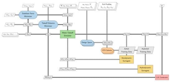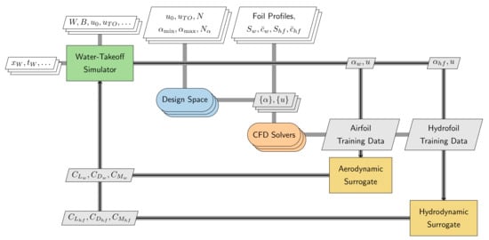 In this work, sample-based surrogate models are selected for their simplicity and non-intrusive nature. To construct the surrogate models, we first need to generate samples by running the high-fidelity analyses. A design of experiments is performed to generate the design space by selecting N in the speed range , with initial speed , to generate a set and samples in the angle of attack range to generate a set . The Cartesian product of these sets defines the design space to generate CFD training and testing data for the surrogate, as will be discussed in Section 4.2.2. Similar arguments can be applied to airfoils, so surrogate models are also considered for them in the framework, although they may not be necessary with the use of low-fidelity solvers, which is to be further discussed in Section 3.4.2. The water-takeoff analysis with surrogate models is presented as an XDSM in Figure 4.