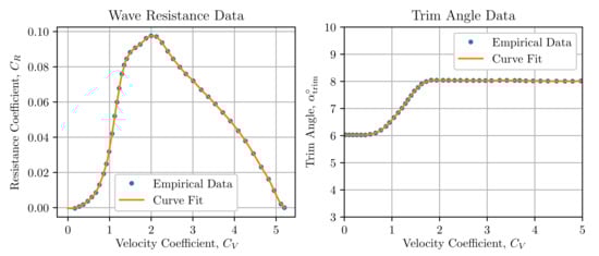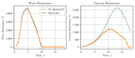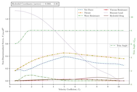 where m and denote mass and acceleration, respectively. Equation (12d) consists of the contributions towards lift and drag from the wing and hydrofoil at their respective angles of attack, and Equation (12a) is the thrust force T at some thrust inclination angle . The remaining force terms on the right-hand side, such as the hull resistance and viscous resistance, are described in detail below.