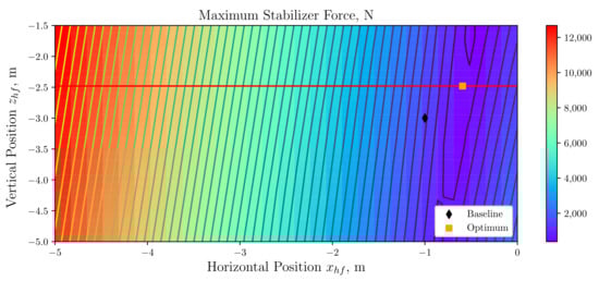 The hydrofoil location in the amphibious aircraft is determined primarily based on the stability and trim requirements. The hydrofoil must generate minimal moments about the aircraft center of gravity (CG) until the speed at which the elevator is effective enough to provide corrections is reached, while simultaneously providing optimal lift to minimize hull resistance. This objective is attained by considering minimization of the maximum stabilizer force required during a simulated water-takeoff run. The reasoning for the consideration of this objective function will be presented in Section 3.3, and the water-takeoff simulation model will be described in Section 3.2. The optimization problem formulation to determine the hydrofoil location is summarized in Table 2. The hydrofoil location is indicated by the coordinates of its reference point, with respect to the CG as origin. The optimum span and incidence angle from the takeoff distance optimization problem in Section 3.1.3 are provided to the stabilizer force minimization problem, which determines the optimal hydrofoil position. The XDSM diagram is presented in Figure 3.