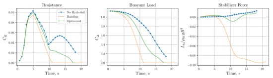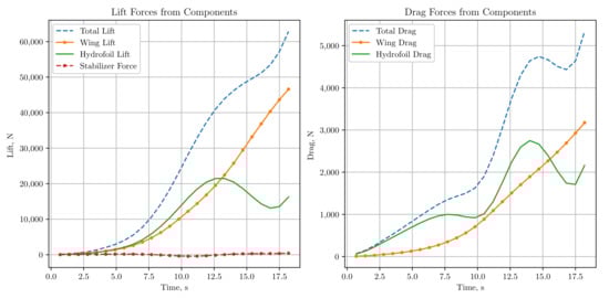 The angle of attack varies with time as a result of the hull’s dynamic trim angle. The consideration of an actuated system for adjusting the angle of attack, while possible, is too complex for an initial design consideration and is deemed beyond the scope of the present study. Note that such an implementation would add structural weight, which needs to be considered in the design process. The lift constraint is considered for the reason that if the aircraft and the hydrofoil are unported from water, the loss of lift from the hydrofoil is extremely large due to the change in density of the fluid from water to air. This would result in the weight exceeding the total lift in this condition, and the aircraft would crash onto the water, resulting in unstable effects on the resistance and trim.