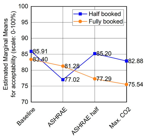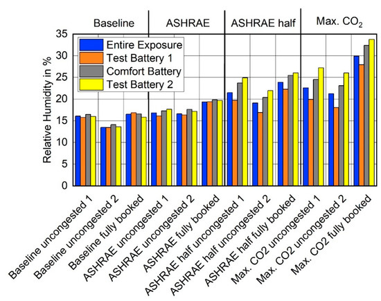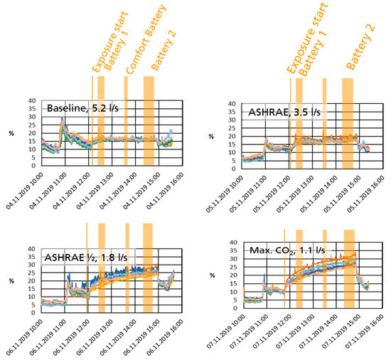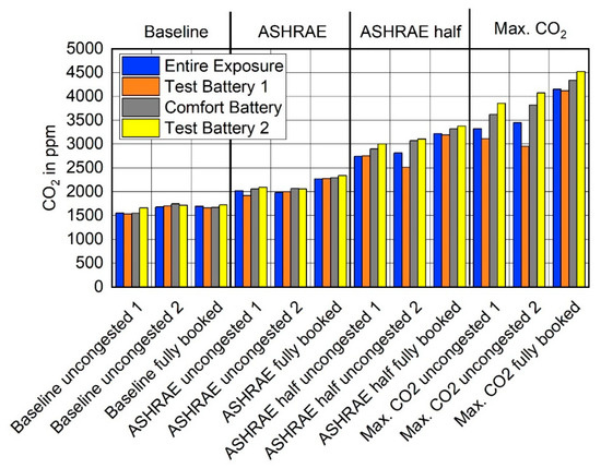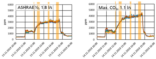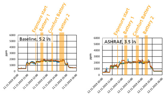 - ASHRAE half: Half the required outdoor airflow rate (1.8 L/s/passenger). Because the CO2 level follows the inverse of the outdoor airflow rate, this point was chosen because it was pre-assessed to be in the middle between the ASHRAE and the Max. CO2 condition.