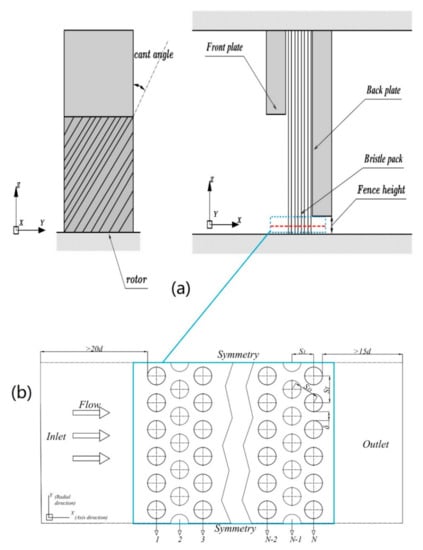 The experiment is one important way to study brush seals. For example, Manuel et al. [] studied the effect of the inner diameter of the back plate on the seal performance. However, with the fast development of computer technology, computational fluid dynamics (CFD) has been widely used in the analysis of seal performance. For instance, Li [] investigated the leakage flow characteristics of labyrinth brush seal with CFD software. Lee [] evaluated the impact of the position of brush seal on the rotor dynamic coefficients with numerical simulation.