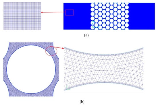In this paper, two different grids are used to establish the 2D tube bank model in GAMBIT. The unstructured grid is used in the zone of the bristle pack because of the complex construction, as shown in Figure 2a. Since the geometry of other zones is simple, a structured grid is enough. According to the grid independence test [], 220 nodes are distributed on the surface of the bristles. The boundary sublayer thickness is 7 × 10−5 mm. The growth rate is 1.2, and the number of boundary layers is 4, as shown in Figure 2b.