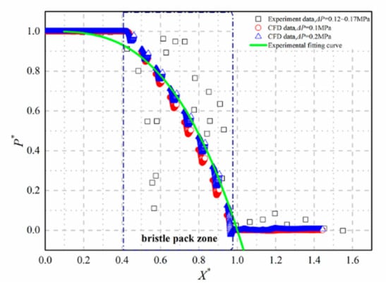 The working fluid flows through the clearance between rotor and back plate in the X-direction, and only little fluid flows through the bristle pack in the Z-direction. Therefore, the 2D tube bank model is reasonable. To justify the model, this paper compares the simulation data with the experimental data [], as shown in Figure 3. P* is the dimensional normalization for the pressure P, and X* is the axis position of X,