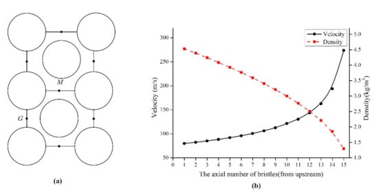 To study the velocity distribution and the density distribution of the gap, this paper extracts the simulation data of the midpoint of the gap centerline, as shown in points G and M in Figure 4a, and the results of the velocity change and density change in the bristle gap are shown in Figure 4b. The growth rate of velocity increases when the growth rate of density decreases. This change is described as index movement, which means that the flow is accelerated and expanded. According to conservation of mass, these finds can explain the reason for the accelerative flow which is found in Huang’s and Kang’s works [,]. Meanwhile, according to the polytropic process [], the relationship between ρ and P satisfies the following equation: