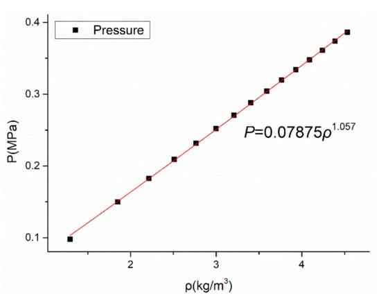 where n is the polytropic exponent, and c is the constant. To investigate the flow in the bristle pack, according to Equation (9), the case in which SD/d = 1.10 and ΔP = 0.3 MPa, the results from the numerical simulation can be fitted as follows: P = 0.0788 × ρ1.057 (show in Figure 5).