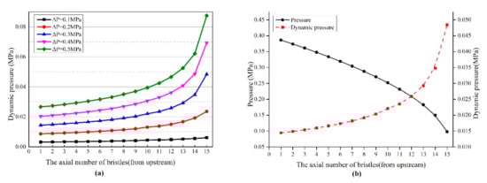 The dynamic pressure distribution with different rows of bristles is shown in Figure 7b. The growth rate with 20 rows is 0.06422, which is lower than that of 10 and 15 rows, thereby indicating that the increase in bristle rows can suppress the increase in dynamic pressure. As the axial number of bristles increases, the dynamic pressure decreases, suggesting that the mass flow rate will decrease.