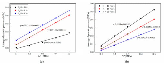 The spacing of the bristles and the number of rows of the bristles are important parameters for designing brush seals [,]. Three different spacing and three different numbers of tube rows are used to investigate the impact of these parameters. As shown in Figure 7a, δ has a significant impact on the dynamic pressure, and the dynamic pressure increases as the ΔP increases. Meanwhile, decreasing δ can reduce the dynamic pressure, that is, a small δ can effectively restrain the pressure energy transformation into kinetic energy. Curve fitting results show that the slope is 0.0459 when SD/d = 1.05, which is smaller than that of with other gaps. Therefore, under SD/d = 1.05, the fluid is blocked well.