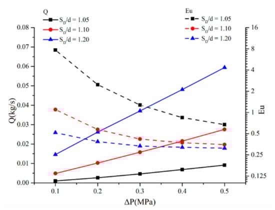 In accordance with Equation (12), Eu is studied in a bristle pack with different gaps, and the results are shown in Figure 8. In general, Eu decreases as the pressure difference increases. The average value of Eu for SD/d = 1.05, 1.10 and 1.20 is 2.594, 0.562 and 0.373. Therefore, when SD/d = 1.05, Eu is 4.62 times larger than that of the SD/d = 1.10 and 6.95 times larger than that of SD/d = 1.20, respectively. This finding indicates that the ability to convert pressure drop to dynamic pressure head is weaker than that of the SD/d = 1.10 and SD/d = 1.20 cases. According to thermodynamics [], this phenomenon occurs because when 1 < n < κ shown in Table 3, the gas is heated and expanded, which indicates that the aerodynamic drag is not the main reason for kinetic energy consumption. In addition, when SD/d = 1.05, n is the lowest and close to 1. This means that the gas under SD/d = 1.05 condition is close to the isothermal process, and the pressure energy can transform more internal energy under the no-heat-exchange condition. This physical phenomenon is caused by the strong viscous resistance and interference drag in the small gap condition. As a result, the temperature of the SD/d = 1.05 case is higher than that of the others. When Eu decreases, the leakage rate increases, as shown in Figure 8.