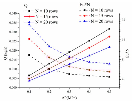 Eu*N and leakage rate Q with different rows. The left axis of Q represents the leakage rate, shown in solid lines, and the right axis of Eu*N represents the total pressure loss, shown in the dotted lines.