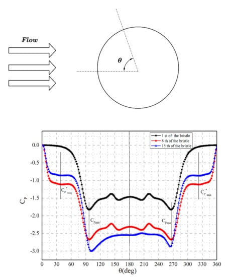 - In the end row, the pressure distribution is asymmetric due to jet deflection. The jet deflection is relevant to the value of ST/d. If ST/d is smaller than 2, then the neighboring bristles have an impact on the fluid. This effect is called nearby interference []. This jet deflection creates an aerodynamic force in the circumference direction, which leads to the oscillation in the end rows and the abrasion between the end row and the back plate. Meanwhile, the location of CPmin in the first row and the eighth row is 96°. The location of CPmin in the end row is 101°. The location of CPmin in the end row moves backward 5° compared with the other rows.