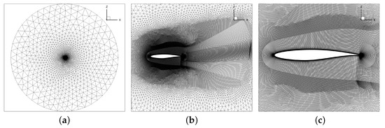 The results are presented for a CFD mesh with about 240.000 nodes, which is depicted in Figure 1. The upper and lower surface of the airfoil are discretized with 300 cells each. The cell size on the main part of the airfoil is about , whereas the leading edge has a finer spacing. It is a hybrid mesh which consists of quadrilateral cells in the vicinity and the wake of the airfoil, see Figure 1b,c, and triangular cells in the remaining parts of the mesh. The farfield extends to a distance of 100 chords in every direction from the airfoil, see Figure 1a. A wall-resolved approach is used and the distances of the first off-body grid nodes satisfy . A grid convergence study is shown in Appendix A.1 and demonstrates the validity of the current mesh.