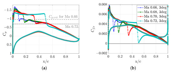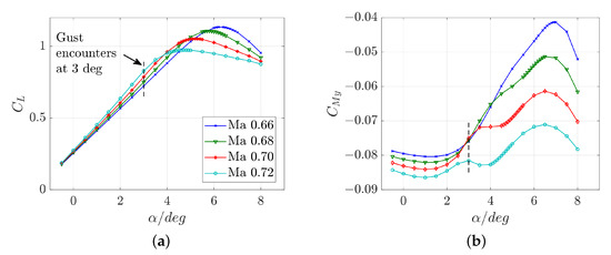 Steady polars are computed for four different Mach numbers: Mach 0.66, 0.68, 0.70 and 0.72 at a Reynolds number of 6.5 Mio. Lift and moment polars are plotted in Figure 3. All lift curves show typical results: with an increase of the Mach number, the maximum lift decreases, but the linear lift curve slope increases. Pitching moment coefficients are referenced to the quarter-chord and show more nonlinear trends than the lift coefficient. The dashed vertical lines mark the steady angle of attack deg, which is used during the gust encounters. Pressure distributions for all Mach numbers reveal transonic conditions, see Figure 4a, and the skin friction coefficients show fully attached flow, see Figure 4b.