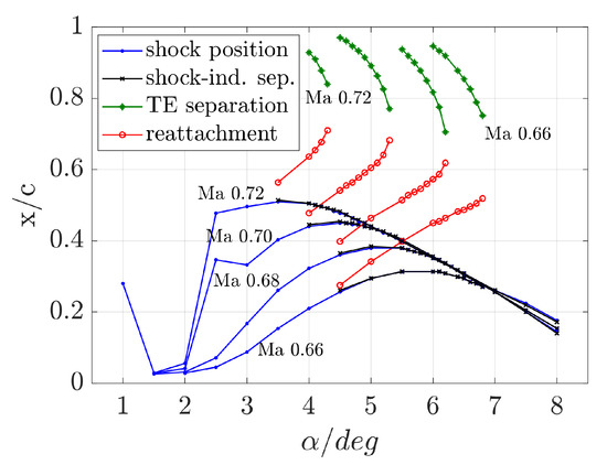 Figure 5 gives an overview about separation and reattachment behavior for this airfoil at the different Mach numbers. Within this work, a shock is detected, if the pressure coefficient is lower than the isentropic critical pressure value , i.e., the local Mach number is higher than 1.0. Then, the x-position of the maximum pressure gradient is defined to be the shock position. Separation occurs if the x-component of the skin friction vector is lower than zero. The qualitative trends of the shock motion and separation are independent from the Mach number: with increasing angle of attack, the shock moves downstream. Until at some condition, shock-induced separation sets in and a separation bubble is formed. Shortly after that angle of attack, the shock reaches its maximum steady position and starts moving upstream, the so-called inverse shock motion sets in. In this specific setting, trailing edge (TE) separation starts at an angle of attack which roughly corresponds to the shock position furthest downstream. This specific fact is just a coincidence and cannot be generalized, as the onset of trailing edge separation is very sensitive to the numerical settings, such as the CFD mesh and turbulence model. At some higher angle of attack, the separation bubble at the shock foot and the trailing edge separation merge and the flow behind the shock starts to be fully separated. Inverse shock motion continues up to the maximum simulated angle of attack. There is a rather large difference in the shock position for the different Mach numbers during the regular shock motion, whereas shock positions during inverse shock motion seem to be almost independent of the Mach number, and more depending on the steady angle of attack. For lower Mach numbers, the transition from fully attached to fully separated flow happens more gradual, i.e., over a wider range of angles of attack, than for higher Mach numbers. Note that the maximum lift coefficient occurs when the shock-induced separation has set in already, but before the flow is fully separated, compare with Figure 3a.