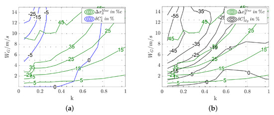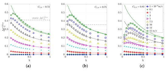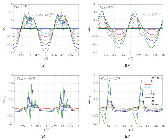 Exemplarily, Figure 6 shows lift and moment coefficients as a function of time for two different gust lengths and the various amplitudes. The responses to both gust lengths are differently affected by the amplitude nonlinearities, compare Figure 6a,b. They have in common, that an increase in the gust amplitude leads to growing nonlinearities and generally, the pitching moment coefficient is more affected by the large amplitudes. A nonlinear response leads to an earlier breakdown of the lift compared to the linear counterparts. For both gust lengths, first visible deviations from linearity are noticeable at about m/s.