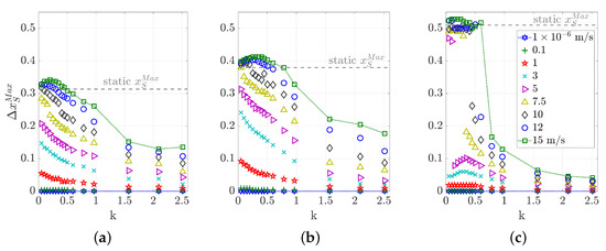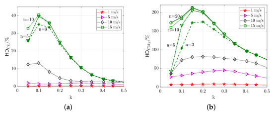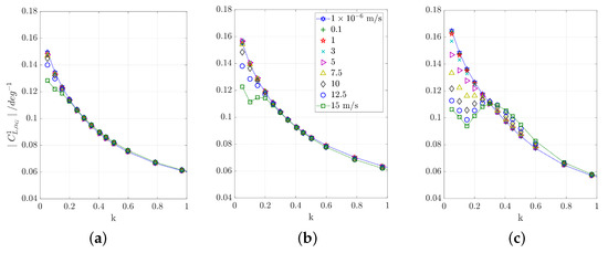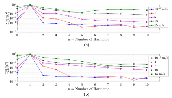 Especially for the longer gust, higher harmonics are present in the high-amplitude responses, which lead to several peaks in the lift and moment curves. Figure 7 illustrates the distribution of the frequency content for the two gust lengths and 5 amplitudes each. For the definition of the frequency content the reader is referred to Equation (6). Larger gust amplitudes trigger higher harmonic content than smaller gust amplitudes. For the long gust with m/s, even the 10th harmonic is only one order of magnitude lower than the first harmonic. This large number of significant harmonics explains the multiple local maxima in the lift response shown in Figure 6a. For the shorter gust with m/s, the 10th harmonic is at around compared to the first harmonic. In a study by Iovnovich [39] a threshold value for the higher harmonics of is defined to mark the limit between linear and nonlinear responses, while it is admitted that this is a quite arbitrary value. For the cases treated here, a limit for the first 10 harmonics of would mean that the gust amplitude needs to be lower than m/s.