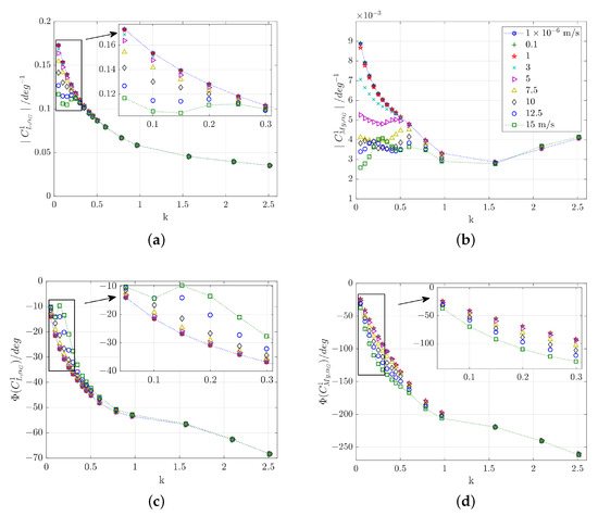 The complex-valued Fourier-coefficients of the lift are denoted by for the respective harmonic n, where the highest harmonic N is limited by the steps per period (SPP) for each frequency . The Fourier-coefficient of the first harmonic gust-induced angle of attack is denoted by . Due to the purely sinusoidal excitation, the input signal consists of only one harmonic. Note that only the very last period of each of the computed time signals is used for the DFT.