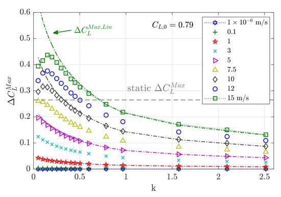 The maximum lift is a relevant value for the loads assessment of an aircraft. Figure 10 summarizes the incremental maximum unsteady lift for all computed gust encounters. Responses to smaller gust amplitudes show a monotonic behavior with increasing frequency, which is a hint for the linearity of the responses. Large amplitudes deviate from the linear results in the range of small frequencies but are almost on-spot for the higher frequencies. Comparing each of the nonlinearly computed maximum lift with its linear reference values (dash-dotted lines), it is noted that first visible deviations occur at m/s. These first deviations occur at lift values that are lower than the static maximum lift. The monotonic trend of the curves is lost when the static maximum lift is overshot for one of the frequencies. With increasing excitation amplitude, the maximum lift moves to higher frequencies. For the cases computed here, there is no saturation found in the maximum lift, but increasing the amplitude leads to higher and higher maximum values. For reduced frequencies higher than 0.7, deviations between linear and nonlinear are not visible anymore. By coincidence, the intersection of each with the static maximum lift value seems to mark the onset of the nonlinear responding range of frequencies at Mach 0.70. This fact is contradicted when looking at the results for the different Mach numbers, see Figure 11. Though all responses which result in a dynamic overshoot deviate from the linear response, it is not the other way round: Maximum lift values that are lower than the static maximum value can also be the result from a nonlinear response. Note that a reduction of the Mach number to Mach 0.66 and Mach 0.68 seems to trigger an overestimation of the nonlinearly computed results compared to the linear ones, whereas an increase of the Mach number to Mach 0.72 seems to facilitate the opposite.