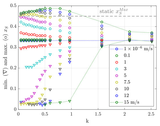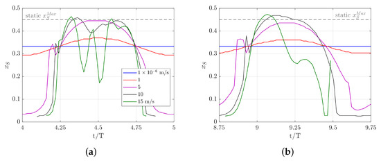 Deviations from the sinusoidal shock motion start to show off as early as m/s. This is significantly earlier than it is the case for lift and moment values, see Section 5.2.2. During one period of excitation, the shock starts to vanish for the first time at m/s for m and at m/s for m. The shock motion in upstream direction from the steady-state shock position is much larger than the shock motion in downstream direction.