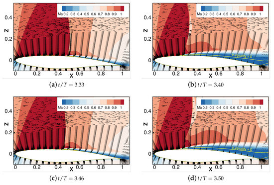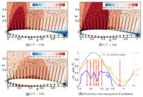 Supersonic regions which extend to almost 50% of the airfoil chord can be observed in snapshots (a)–(f). This is in agreement with the identified shock position shown in Figure 15h. For this specific case, lift and shock motion show three local maxima during one period of oscillation each. Note that the lift curve has a slight lag with respect to the shock motion curve. The snapshot couples (a)–(b) and (c)–(d) reveal a similar dynamic behavior for the first two maxima: just before the peaks, a large supersonic region and a separation bubble about mid-chord of the airfoil are found, see snapshots (a) and (c). The supersonic region then grows further, i.e., the shock moves downstream, until at some point the shock eventually starts to move upstream together with an enlarging region of reversed flow, see snapshots (b) and (d). After snapshot (d), the flow attaches again shortly before snapshot (e) is reached. The third peak in the curves comes without such a big region of reversed flow and is probably limited by the now decreasing edge of the gust velocity. With the decrease of the excitation velocity down to m/s the flow reaches a purely subsonic state, see snapshot (g), which explains the interrupted shock motion curve in Figure 15h.