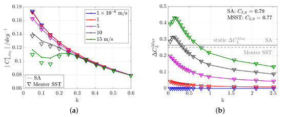 Global variables in comparison between Spalart-Allmaras (solid lines) and Menter SST (symbols) at Mach 0.70. (a) First harmonic of the lift FRF, (b) Maximum lift.