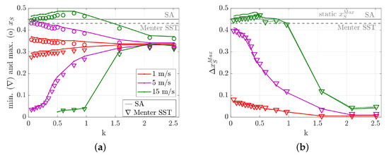 The influence of the turbulence model is larger when local variables are assessed, see Figure 17. The SA model predicts all shock positions further downstream than Menter SST, see Figure 17a, which is observed in several publications [35,37,43]. The agreement between the models is improved for the maximum shock motion, see Figure 17b.