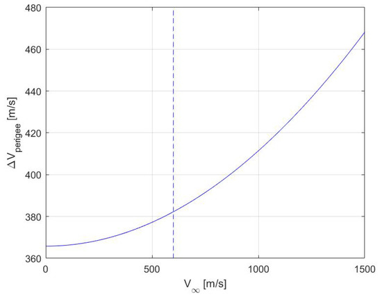 Required at the SSGTO perigee in function of the hyperbolic excess velocity (solid line), and 600 m/s threshold escape velocity (dashed line).