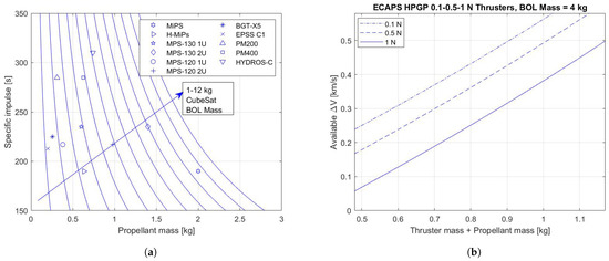 (a) Micro-propulsion systems evaluation chart (blue lines from left to right represent CubeSat Beginning-Of-Life (BOL) mass 1–12 kg); (b) Performances of the ECAPS HPGP thrusters.
