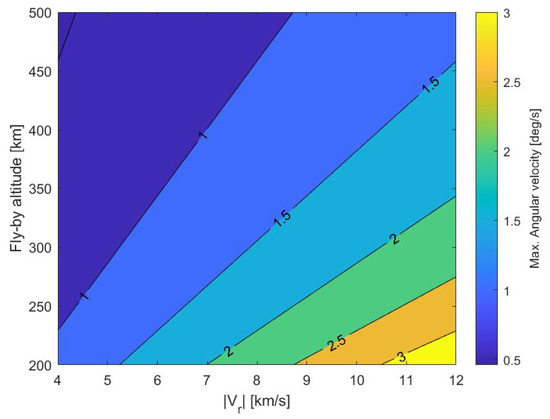 Mass, volume, and pointing accuracy are taken as driving parameters for the trade-off. The declared pointing accuracy of the integrated ADCS presented in this section are in the order of 0.1–0.2 (), with the exception of the XACT-15, which has the finest pointing accuracy. As all the options meet the required pointing accuracy for the payload (0.15), mass and volume play a significant role in the selection, and due to its lower mass and volume, Hyperion Technologies iADCS200 represents the best solution for this application (declared pointing << ). Moreover, it ensures a slew rate larger than 1.5, which allows to keep the target in the FOV for a sufficient range of fly-by altitudes and relative velocities, as it has been reported in Figure 6. The finest pointing accuracy of XACT-15 would be highly beneficial for navigation purposes, as it influences both line-of-sight direction accuracy for planets and asteroid, as reported in Reference [21]. Therefore careful analysis should be performed on that, and eventually replacing the iADCS200 with XACT-15 can be considered, reducing significantly allowable volume and mass for the payload.