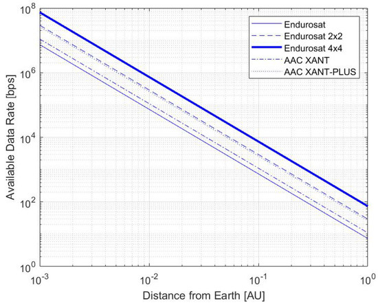 where is the transmitting power, the transmit loss, the antenna gain, the pointing loss, the space loss, the atmospheric loss, the receiver antenna gain, DTP the data to total power, SN the system noise, LM the link margin, and the receiver loss. For the evaluation of a deep-space scenario, these assumption have been made: required Eb/N0 can be assumed equal to 1dB, the required link margin is 3 dB, atmospheric loss is −0.3 dB, transmit loss is −2 dB, receiver loss is −1 dB, atmospheric loss is −0.3 dB, and DTP is −0.6 dB, according to Reference [70]. Based on Equation (4), Figure 7 shows the highest data rate for the most appealing off-the-shelf antennas as a function of the distance from the Earth. The ground antenna considered is a Deep-Space Network (DSN) 34-m diameter, with receiving gain equal to 68.2 dBic, and system noise density equal to −183.6 dBm/Hz. Moreover, to compute the actual time to downlink the entire dataset, ground station availability, together with the actual size of the dataset, shall be investigated. This is left for further analysis, where the actual Earth-target distance has to be considered, to define a proper dataset size and communication time relation, and to evaluate the cost associated to the communication ground station (for this purpose, other ground antenna options, less expensive than DSN antennas, shall be considered).